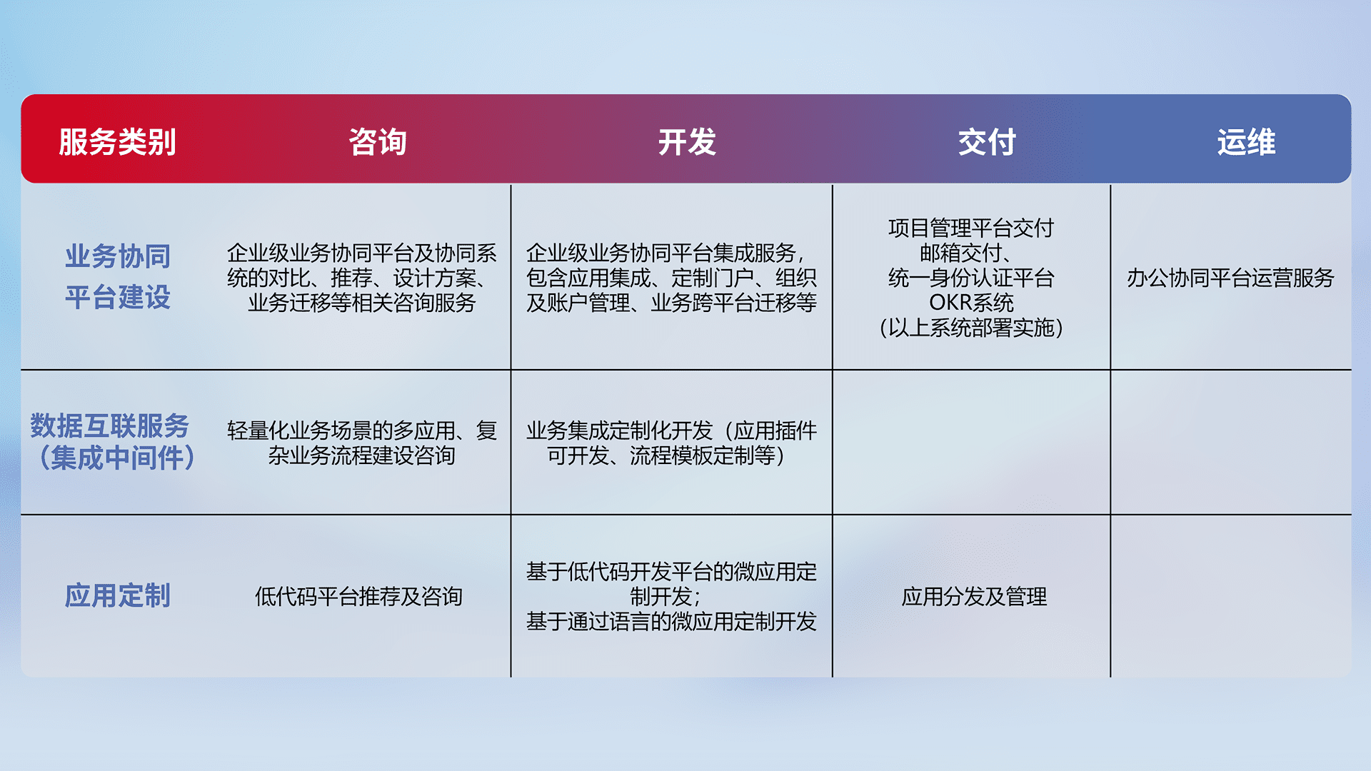 针对钉钉、、、、企微、、、、IDaas等平台级产品提供产品的规划、、、、方案、、、、交付、、定制化开发等服务,,实现如统一协同办公、、智能客户服务、、、、混合会议管理、、、、智能数据查询、、等业务场景,,,,实现数字化转型。。。。